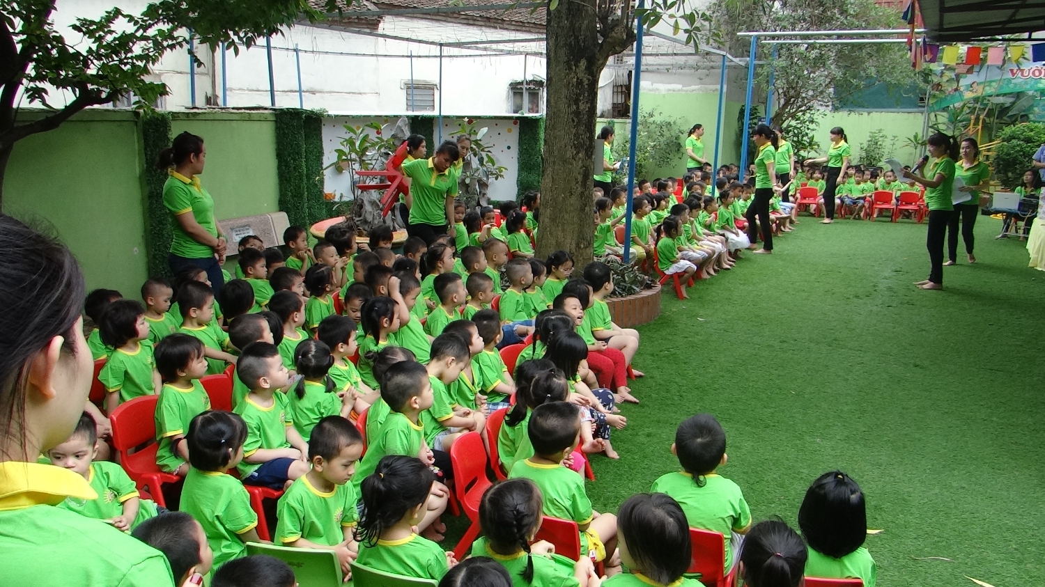 trời đảm bảo an toàn, phù hợp với trẻ. Có cây xanh, thảm cỏ, giàn cây thường xuyên được chăm sóc cắt tỉa đẹp. Có vườn cây của bé, tạo điều kiện cho trẻ chăm sóc cây hàng ngày. Sân vườn được quét dọn sạch sẽ, bố trí sắp đặt gọn gàng khoa học, đảm bảo cảnh quan môi trường sư phạm xanh, sạch, đẹp. Các mảng tường được tận dụng và trang trí thành các khu vui chơi sáng tạo cho trẻ, hơn nữa còn tạo một không gian sinh động hài hòa.