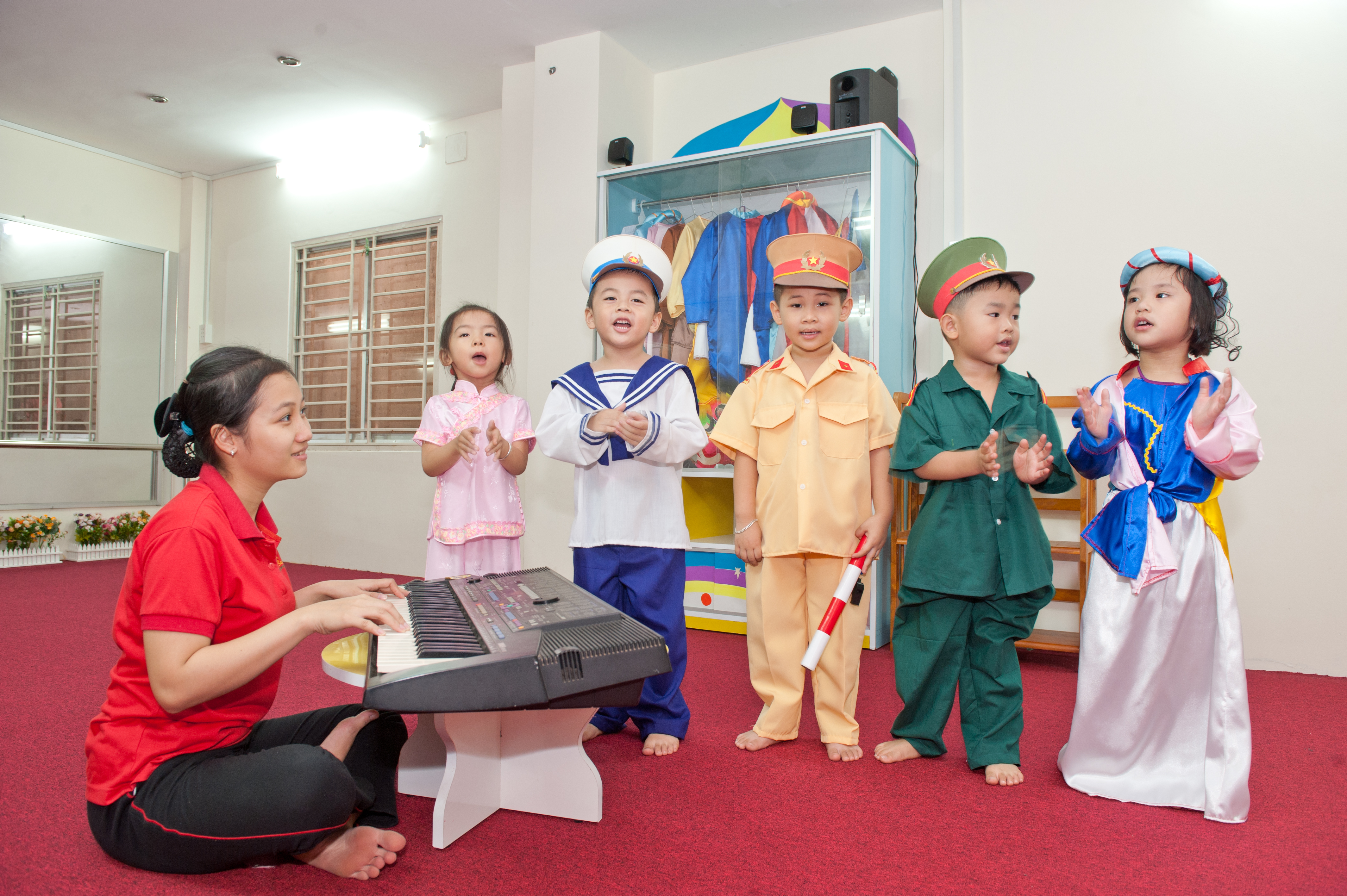 - Các phòng học đạt tiêu chuẩn về diện tích, thoáng mát, ánh sáng mặt trời tốt, sàn gỗ không gây trơn trợt và luôn giữ ấm đôi bàn chân cho bé, hệ thống máy điều hòa giúp bé có giấc ngủ ngon. Thiết bị dạy và học được trang bị đầy đủ, cao cấp, mang tính giáo dục cao, phù hợp với từng độ tuổi. Mỗi phòng học đều được trang bị tivi, đầu DVD hỗ trợ cho việc dạy và học đạt hiệu quả.