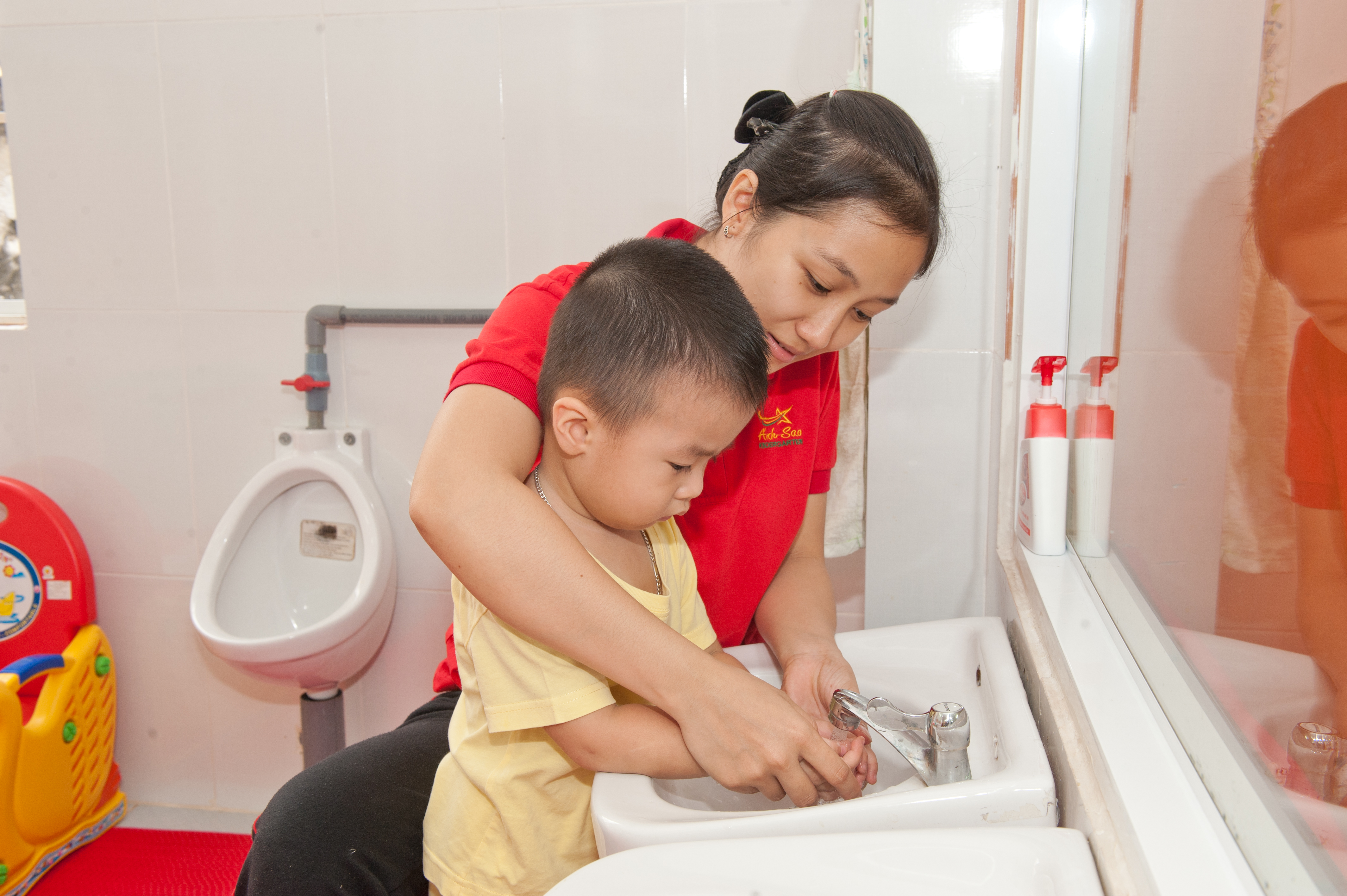 - Hệ thống nhà vệ sinh khép kín, được thiết kế bằng nhôm kiếng giúp giáo viên quan sát tốt. Sàn nhà vệ sinh được trải lót gai nhựa, đảm bảo luôn khô ráo và an toàn tuyệt đối cho bé. Khu vực tắm bé nằm tách biệt trong khu vực nhà vệ sinh.