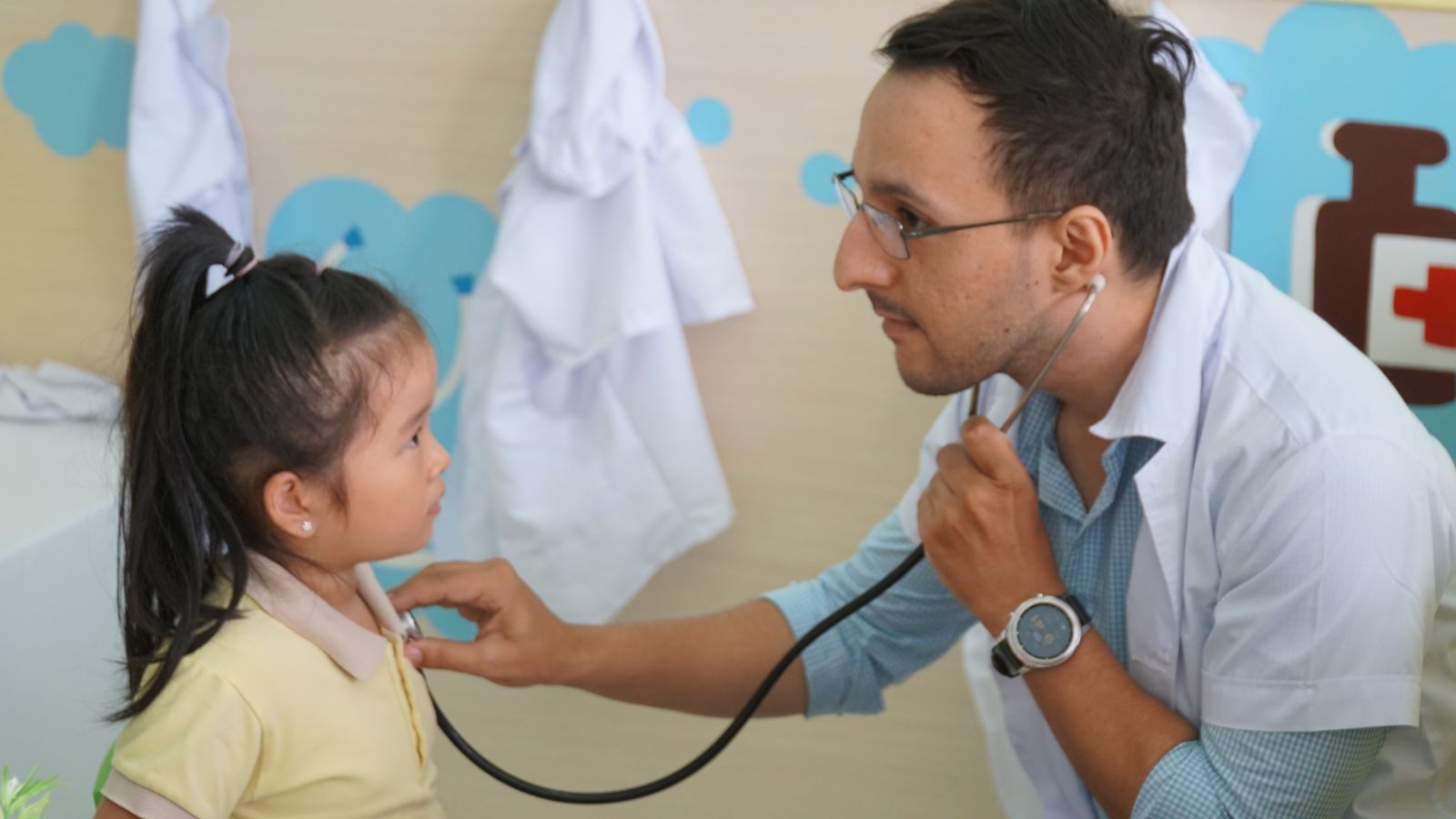 + Nhân viên y tế luôn theo dõi chăm sóc sức khỏe cho các cháu hàng ngày.