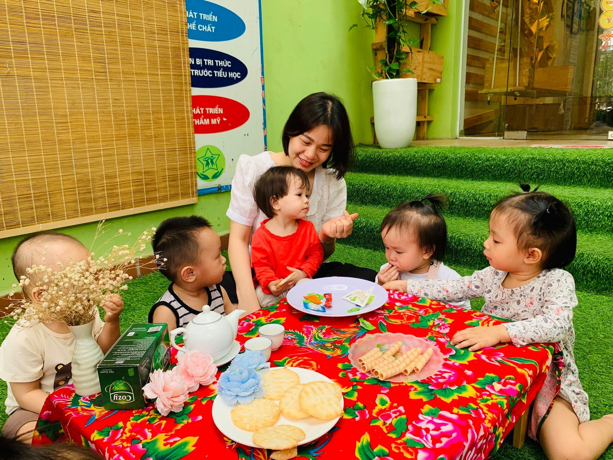 Trường có sân chơi trong nhà rộng 150m2 với rất nhiều đồ chơi phục vụ vận dộng và vui chơi của bé.