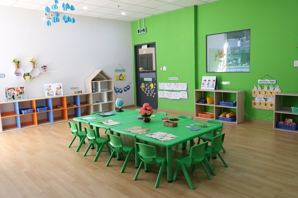- Phòng Anh văn; Trẻ được học với giáo viên nước ngoài với các môn học như STEM, ngữ âm, từ vựng, ... với các học cụ thiết kế riêng phục vụ cho từng tiết học giúp trẻ tiếp thu nhanh và hiệu quả hơn.