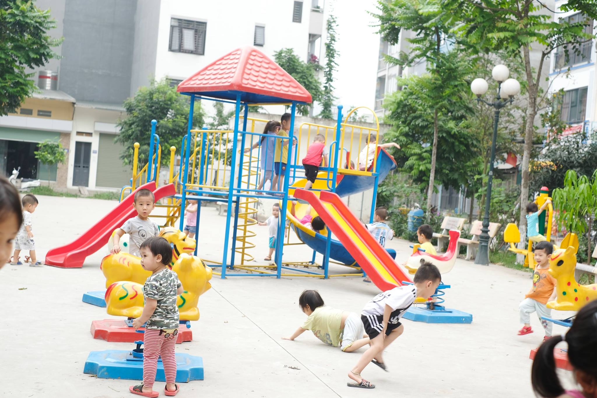 Khu vui chơi ngoài trời cạnh trường, khu vườn trồng rau củ quả trên sân thượng tầng 7.