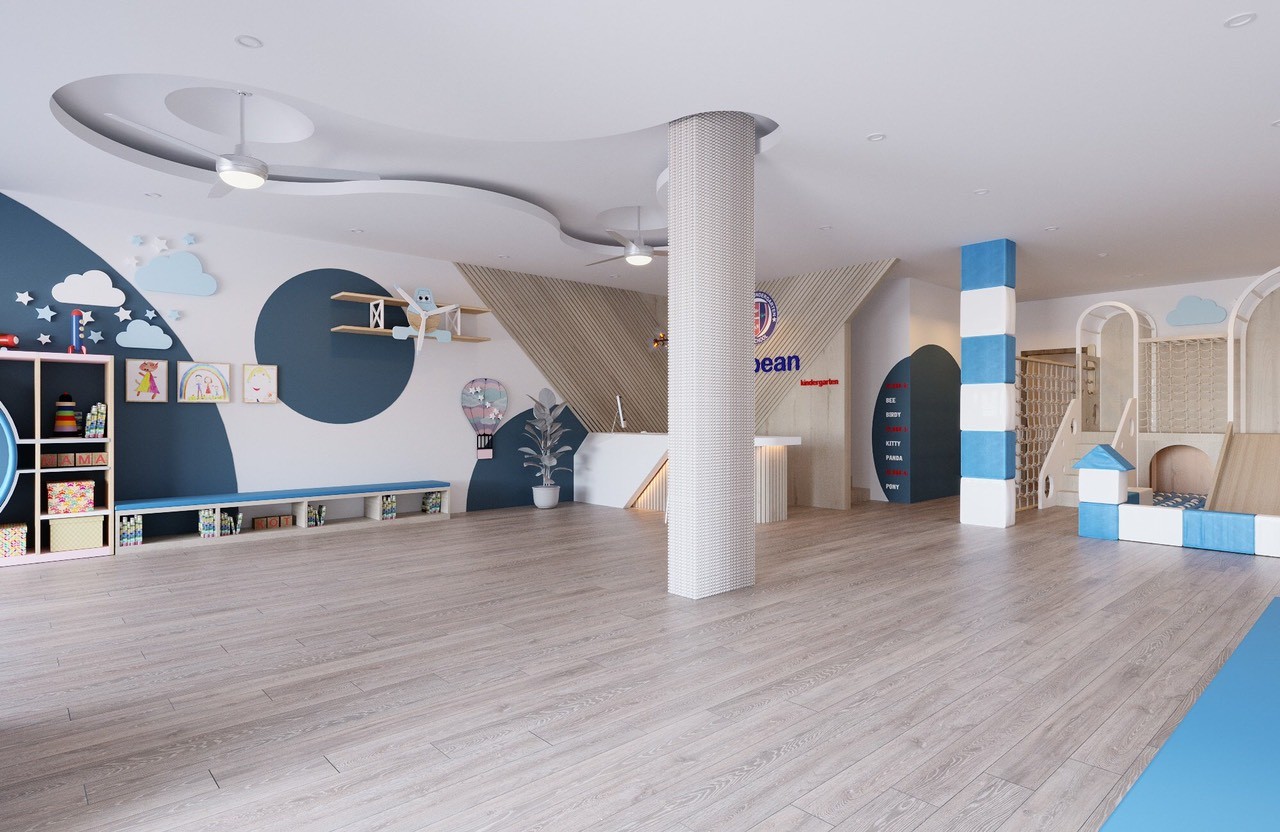 Lớp học rộng, có ánh sáng tự nhiên.