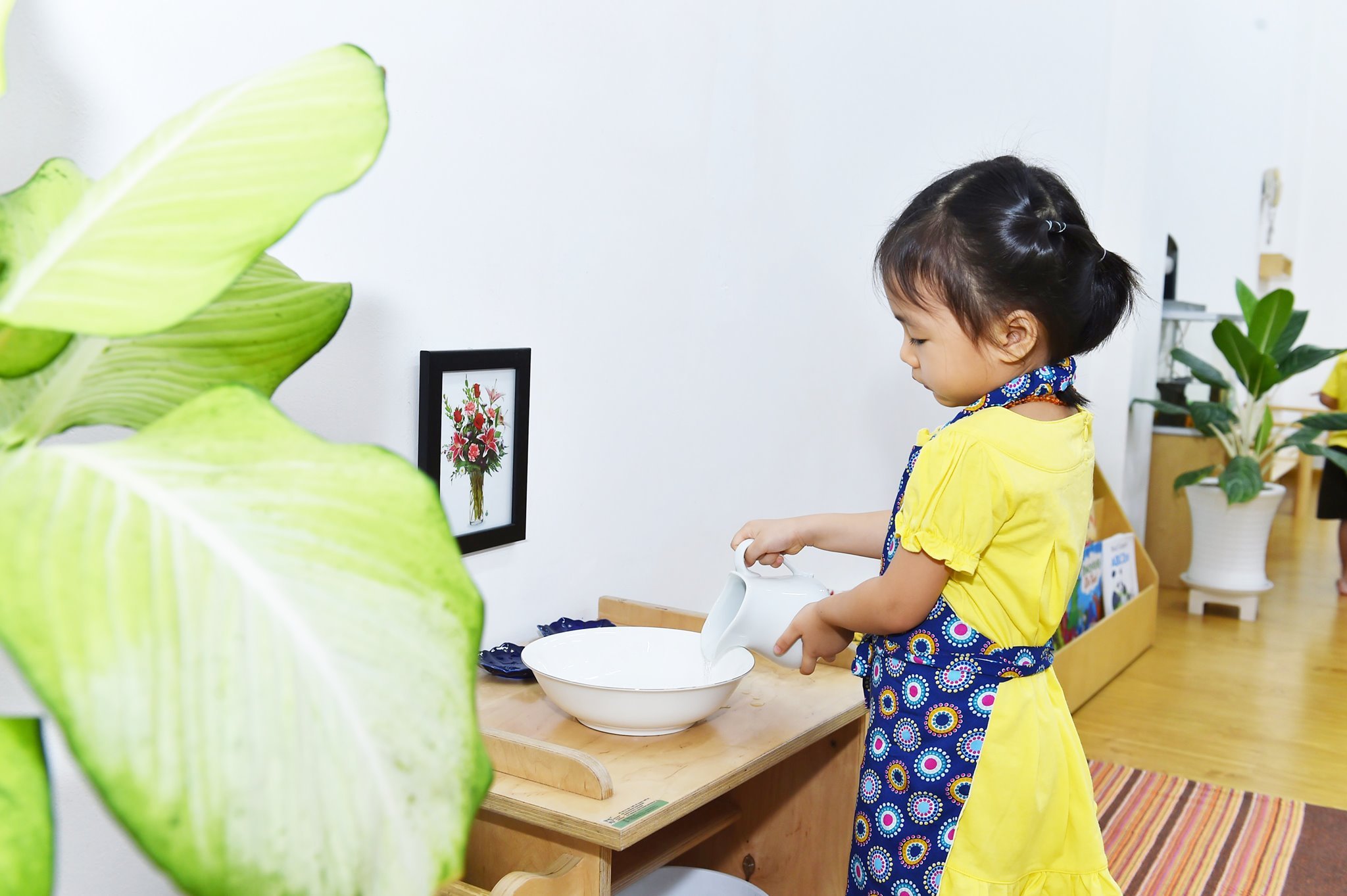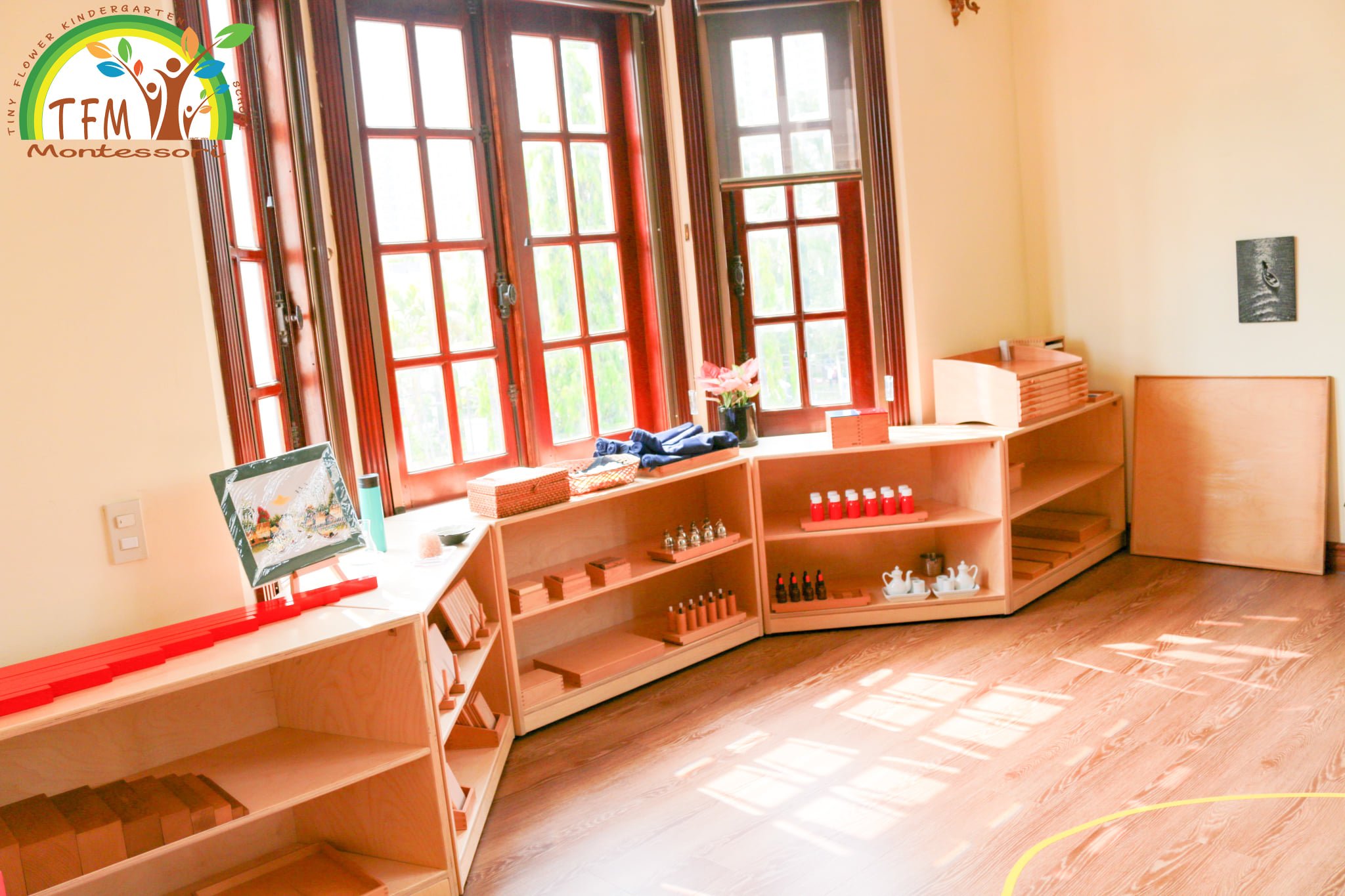 - Mỗi phòng học các giáo cụ được bố trí theo phương pháp Montessori chính thống, phù hợp để phát triển tư duy cho trẻ, gồm 5 góc học tập chính: Góc thực hành cuộc sống, Góc Toán học, Góc Văn hóa, Góc giác quan, Góc ngôn ngữ.