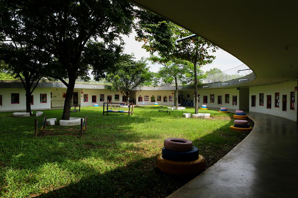 Các lớp học gắn nhiều cửa kính, bên ngoài được phủ bởi những giàn cây leo tạo cảnh quan thoáng mát và đầy nắng, gió tự nhiên dễ dàng lùa từ bên ngoài vào phòng học. Các khu vui chơi lộ thiên trang bị nhiều mô hình trò chơi vận động được sắp đặt khéo léo trong khuôn viên trường, tạo điều kiện cho trẻ phát huy tối đa khả năng vận động, phát triển tư duy và thể chất.