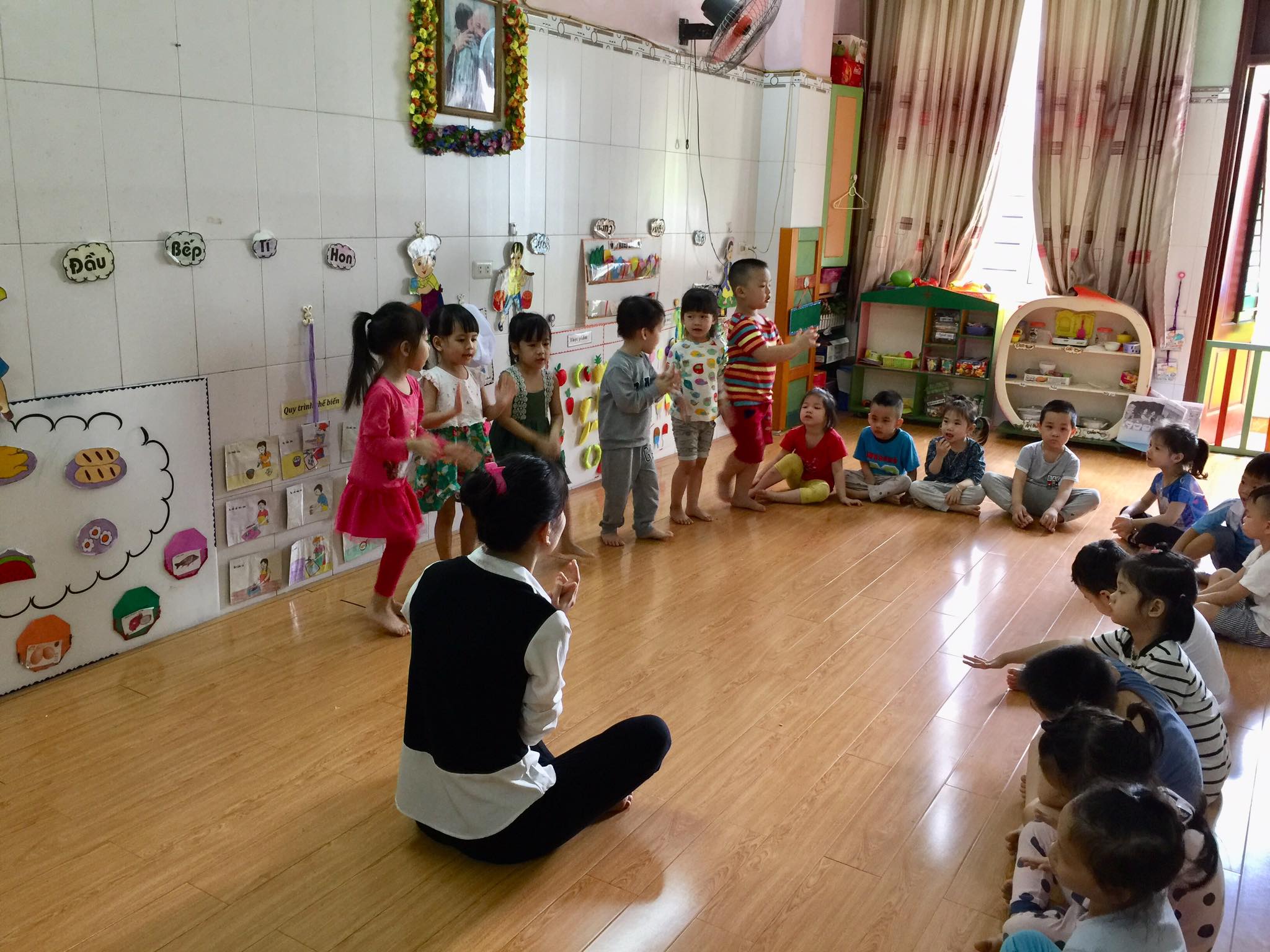 "Môi trường thoáng mát, sạch sẽ. Phòng học có cửa to thông thoáng. Cô giáo ân cần, yêu trẻ."